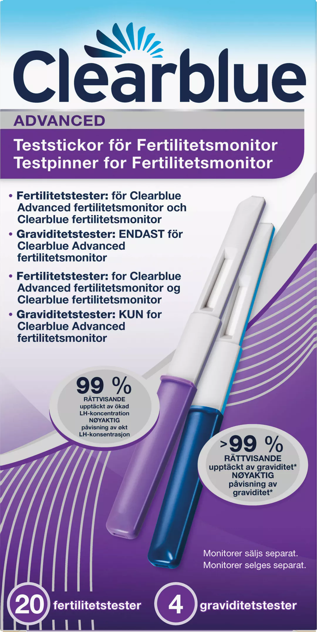 Förpackning med 20 fertilitetstest och 4 graviditetstest - endast för bruk med Clearblue Advanced fertilitetsmonitor som köps separat. Observera att dessa tester inte kan användas med Clearblue digitala ägglossningstest.