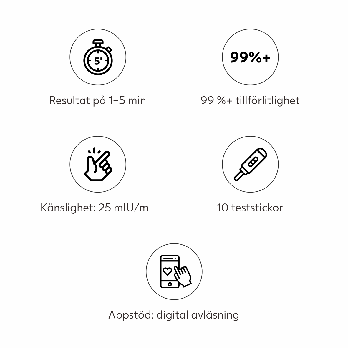 SmileReader-testerna ger snabba och exakta svar och kan läsas av både visuellt och via appen. Med appen får du en tydlig överblick över hela din cykel, dina resultat och dina fertila perioder.