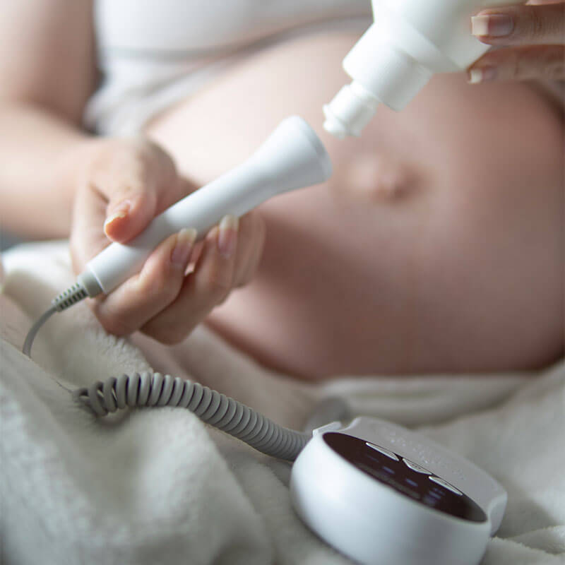 - Hitta den optimala positionen för att registrera fostrets hjärtfrekvens genom att känna fostrets position med händerna. Applicera en lämplig mängd ultraljudsgel på probens akustiska yta; sätt probens akustiska yta mot den gravida kvinnans mage och flytta proben långsamt för att få en optimal ljudsignal. Justera volymen efter behov.